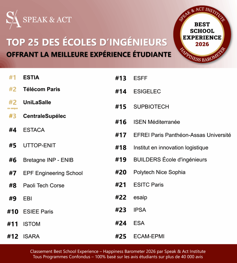 Entre 2025 et 2026, les étudiants ont évalué leur école selon des critères déterminants : qualité académique, environnement et infrastructures, vie associative, reconnaissance par les employeurs, réseau alumni, accompagnement et insertion professionnelle.